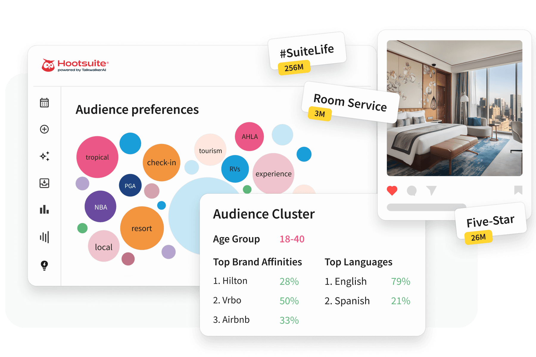 Hootsuite, con la tecnología de IA de Talkwalker, ayuda a las marcas del sector de la hostelería a entender lo que dicen, sienten y comparten en tiempo real sus clientes. Obtén toda la información basada en datos que necesitas para proteger la reputación de tu marca, perfeccionar tu estrategia de marketing e impulsar la demanda.