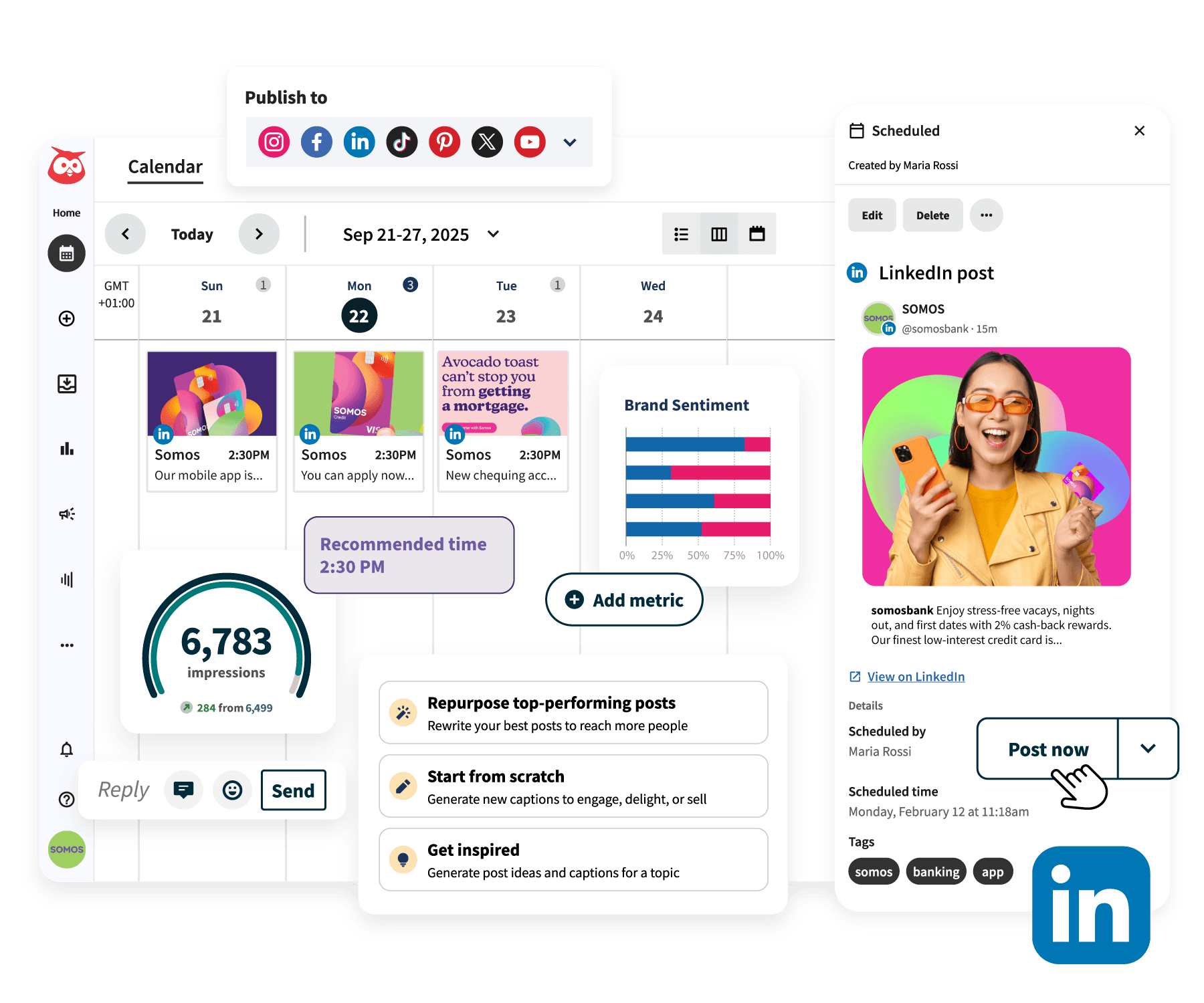 Publica, programa y analiza el contenido de LinkedIn, todo en una sola pestaña. Maximiza el alcance y la interacción con menos esfuerzo y en menos tiempo.