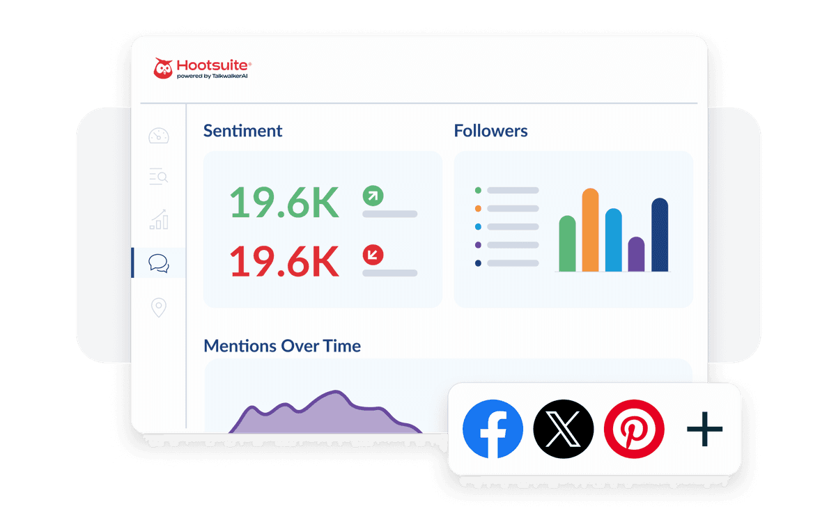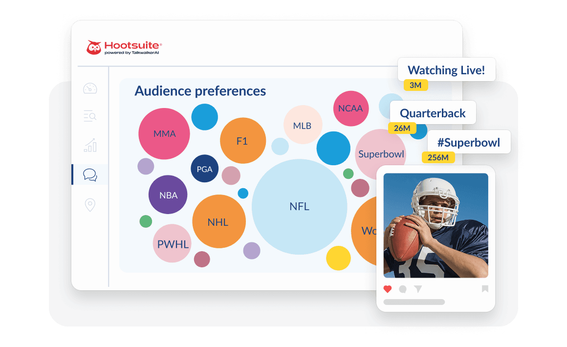 Desde la televisión en horario de mayor audiencia hasta comunidades en línea especializadas, Hootsuite, con la tecnología de IA de Talkwalker, detecta cada mención que se hace a tu marca dondequiera que ocurra.