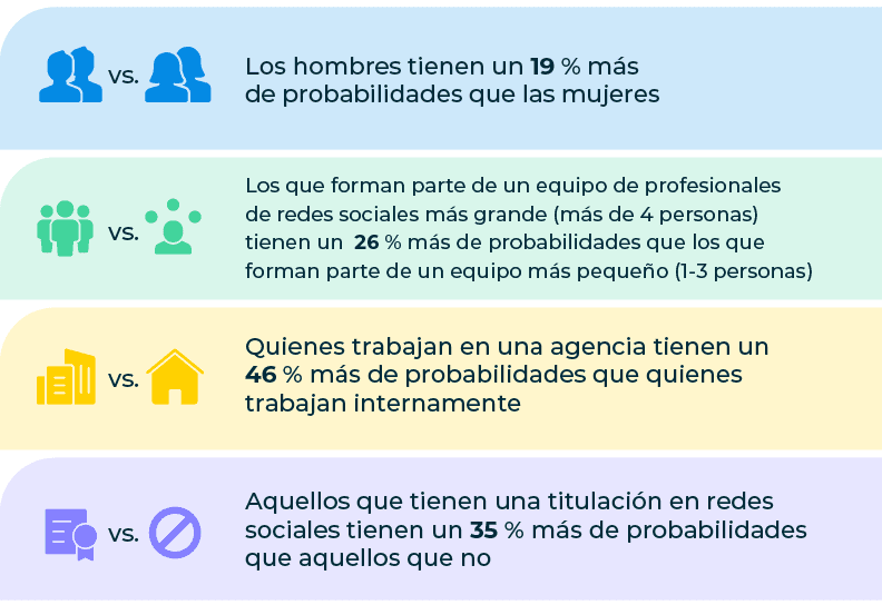 Gráfico que muestra que los hombres tienen un 19 % más de probabilidades de ser ascendidos que las mujeres; los que trabajan en un equipo social más grande (+4), un 26 % más que los equipos más pequeños; las agencias, un 46 % más que las empresas; y aquellos con una titulación en redes sociales tienen un 35 % más de probabilidades.