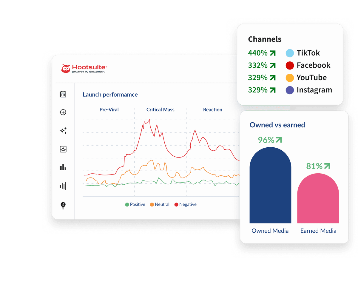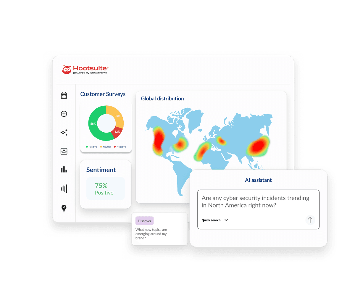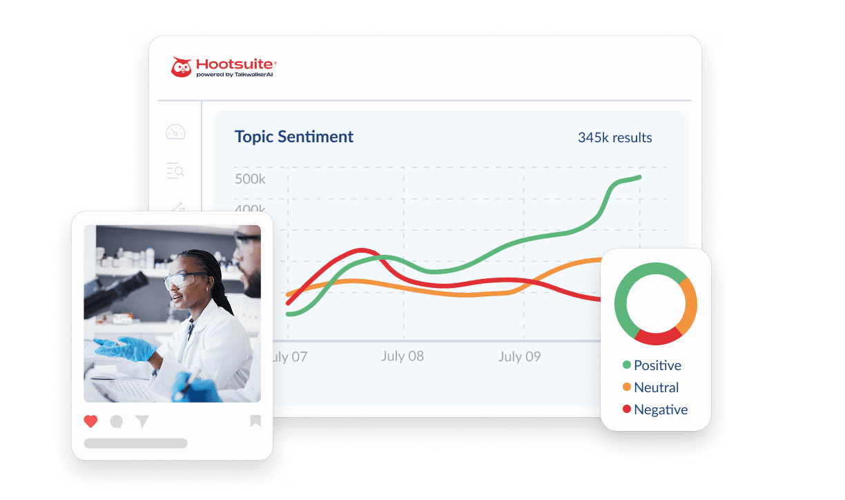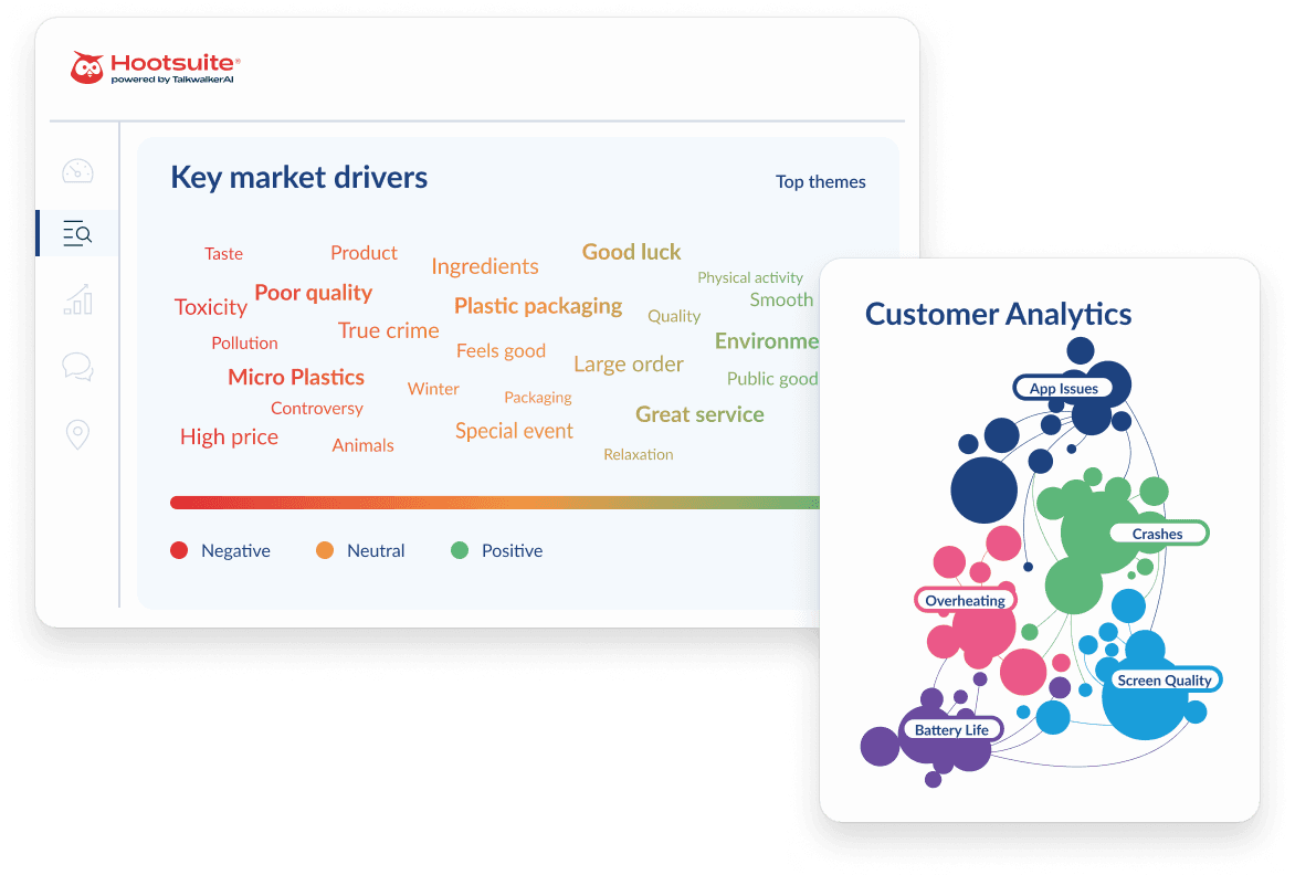 Identifiez les tendances émergentes, quantifiez le sentiment, découvrez les influenceurs clés et reliez les performances au chiffre d'affaires avec Hootsuite, qui repose sur l'IA de Talkwalker.