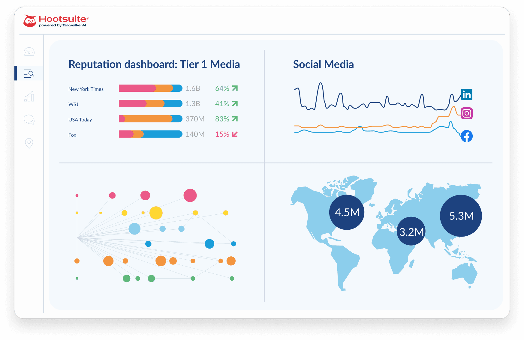 Oui. Hootsuite est un logiciel de gestion de réputation de premier plan pour les agences et les prestataires de services qui repose sur l'IA Talkwalker. Personnalisez les tableaux de bord et les exportations avec votre propre image de marque pour fournir des informations professionnelles prêtes à l'emploi pour les clients. Présentez la veille médiatique, l'analyse des sentiments, les benchmarks concurrentiels et les analyses de crise sous votre propre marque.