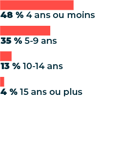 Graphique de « l'expérience des médias sociaux des personnes interrogées », avec les résultats suivants : 48 % 4 ans ou moins, 35 % 5 à 9 ans, 13 % 10 à 14 ans, et 4 % 15 ans ou plus.Lieu de travail des salariés interrogés