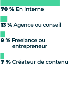 Un grafico mostra "il tipo di occupazione dei partecipanti al sondaggio", che risulta essere per il 70% composta da lavoratori interni, per il 13% da lavoratori in agenzia o consulenti, per il 9% da freelance o appaltatori e per il 7% da creatori di contenuti.Esperienza degli intervistati nel social media marketing