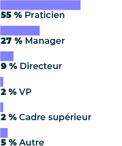 Un grafico che mostra la funzione lavorativa "dei partecipanti al sondaggio che lavorano come dipendenti" con risultati che mostrano che il 55% è costituito da professionisti, il 27% da manager, il 9% da direttori, il 2% da VP, il 2% da alti dirigenti e il 5% occupa altri ruoli.Tipologia di impiego degli intervistati