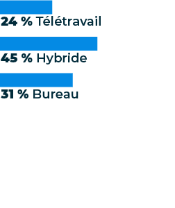 Un grafico che mostra il "Luogo di lavoro degli intervistati del sondaggio che lavorano come dipendenti": il 24% lavora da remoto, il 45% in modo ibrido e il 31% dall'ufficio.