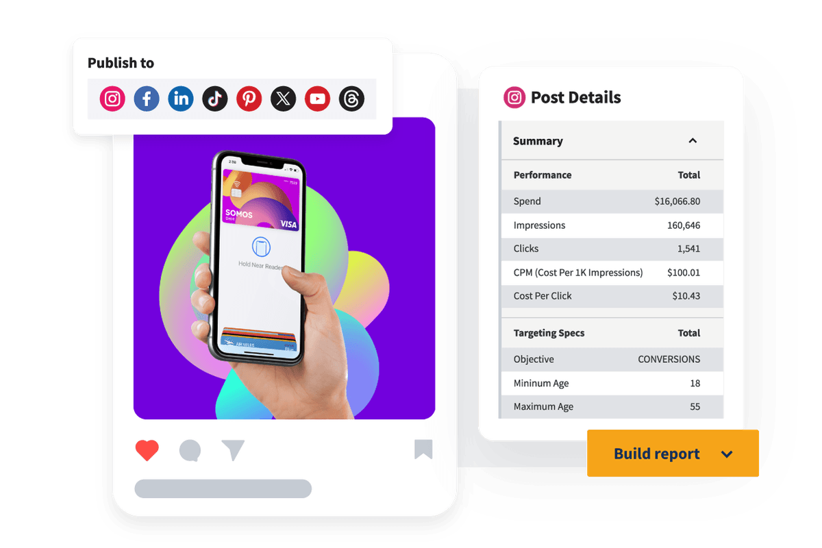 Manage your paid and organic content side by side in one convenient dashboard. Create social ad copy in seconds with AI, boost or auto-boost your organic posts in a few clicks, and design high-performing paid social posts with Canva.