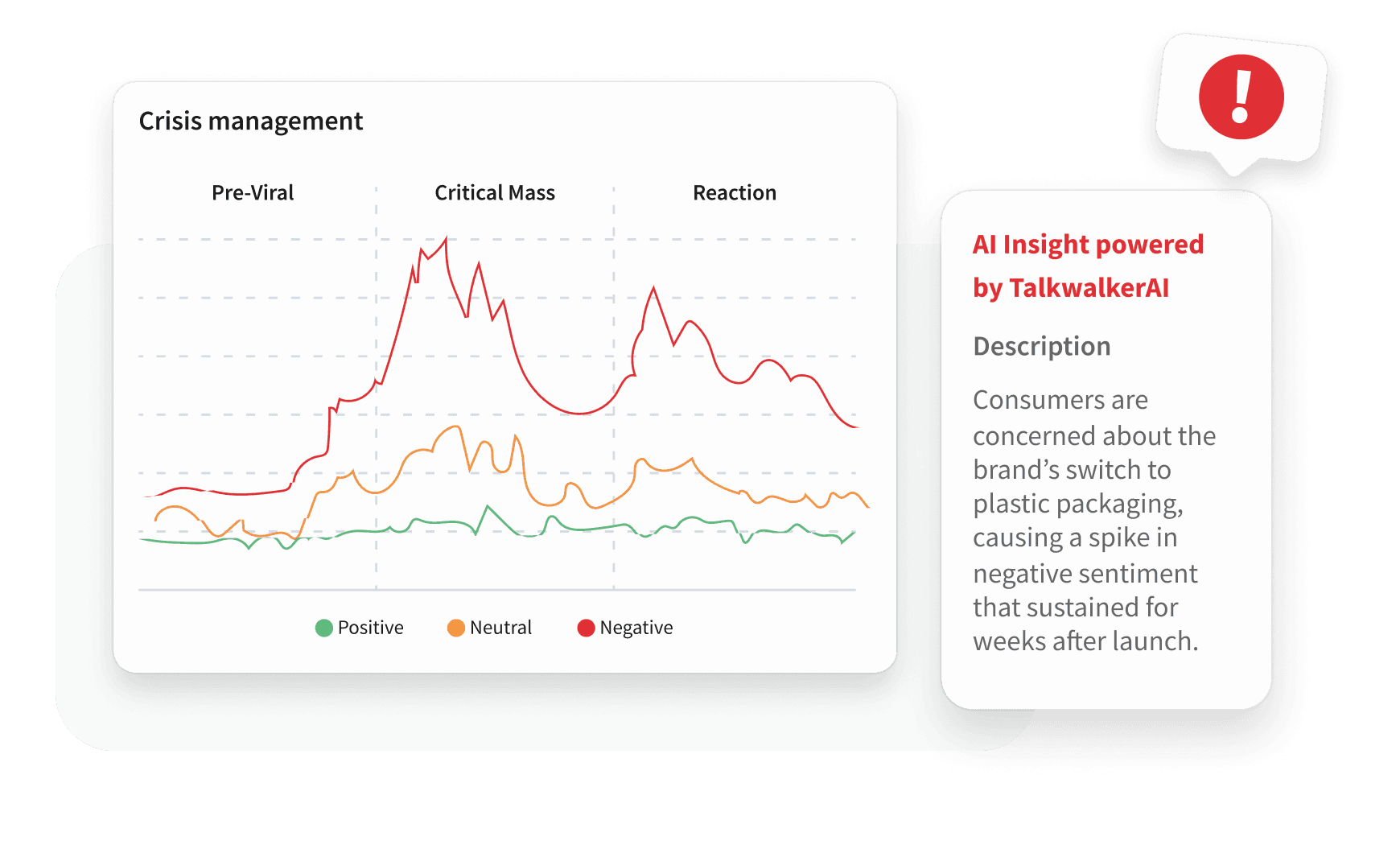 Fique atento a picos incomuns de menções, mudanças negativas no sentimento e narrativas que se desenvolvem rapidamente. Com detecção de anomalias impulsionada por IA, alertas em tempo real, acompanhamento de impacto e análise cronológica, você saberá sempre se uma crise está se desenvolvendo.