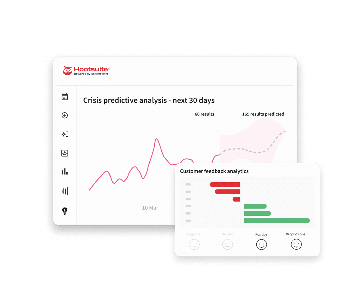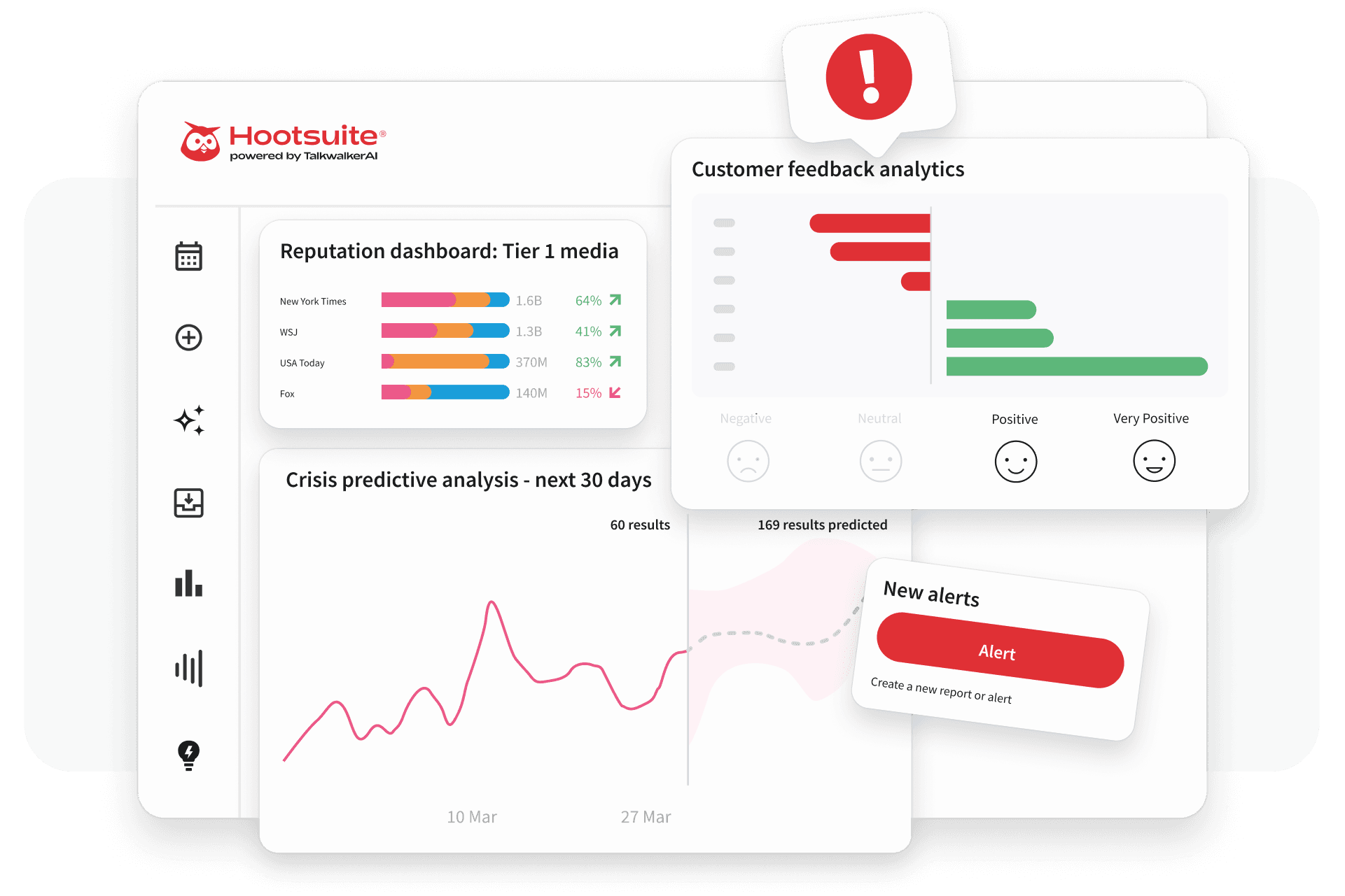 O Hootsuite com o Talkwalker AI monitora a reputação da marca ao acompanhar milhões de conversas em mídias sociais, notícias, blogs, fóruns e sites de avaliação em tempo real. O Blue Silk™ AI analisa o sentimento, detecta picos incomuns de atividade e destaca riscos emergentes antes que se agravem. Com painéis de controle unificados, benchmarking competitivo e alertas automatizados, obtém-se uma visão completa e permanente de como sua marca está sendo percebida em todos os canais.