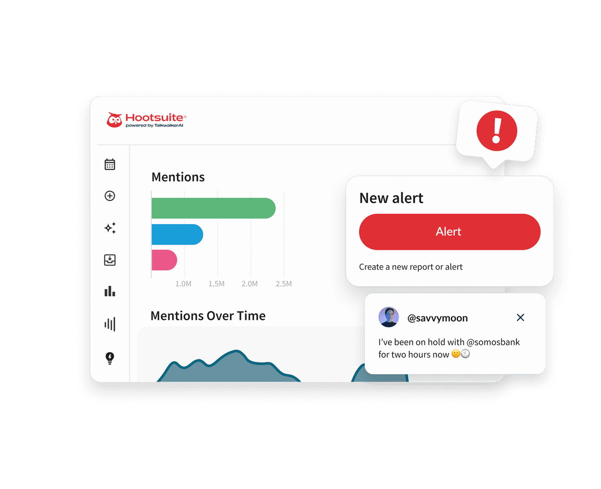 Proteja a reputação da sua marca de forma eficiente com alertas de menções em tempo real, gestão de avaliações e rastreamento proativo de sentimentos. Tudo isso no Hootsuite com Talkwalker AI.