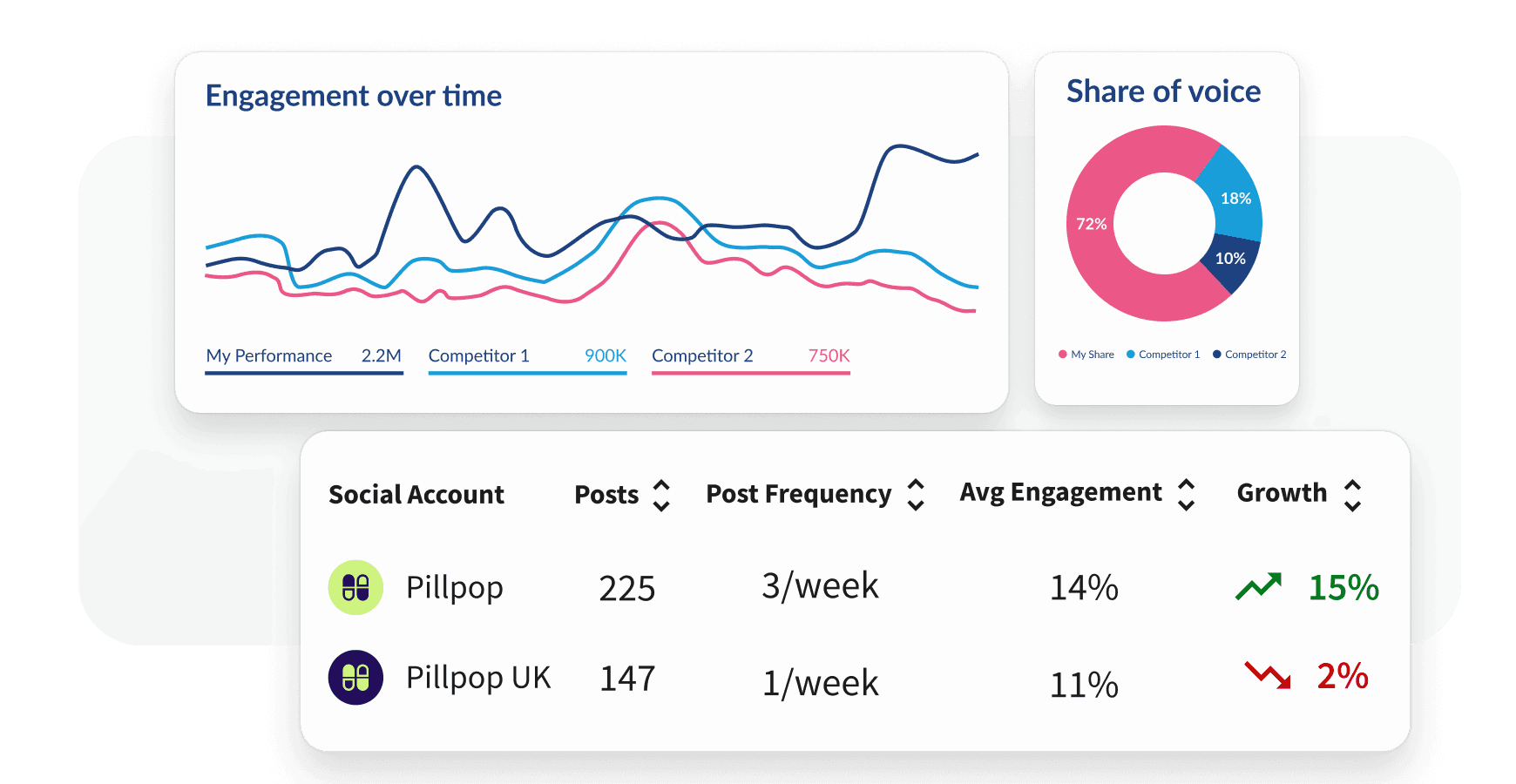 Garanta que você sempre esteja no topo da lista de classificações, para que os potenciais clientes saibam que devem escolhê-lo ao final da jornada de compra. Compare o desempenho e o sentimento de suas avaliações com os dos concorrentes, a fim de identificar pontos fortes, pontos fracos e oportunidades de diferenciação.