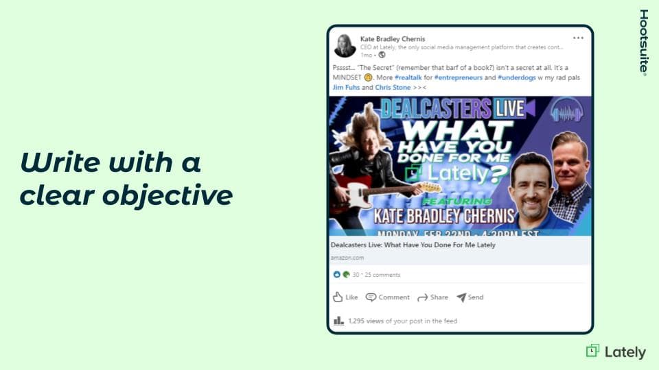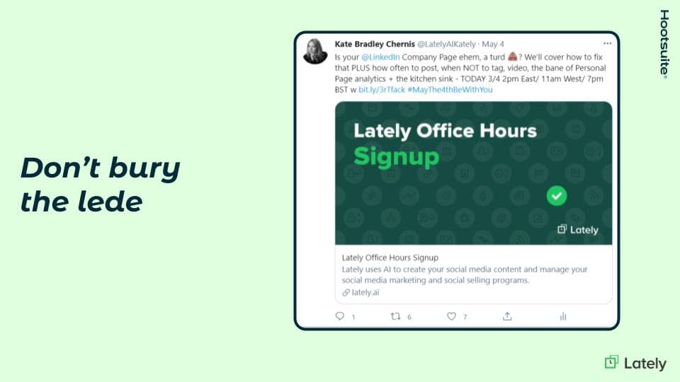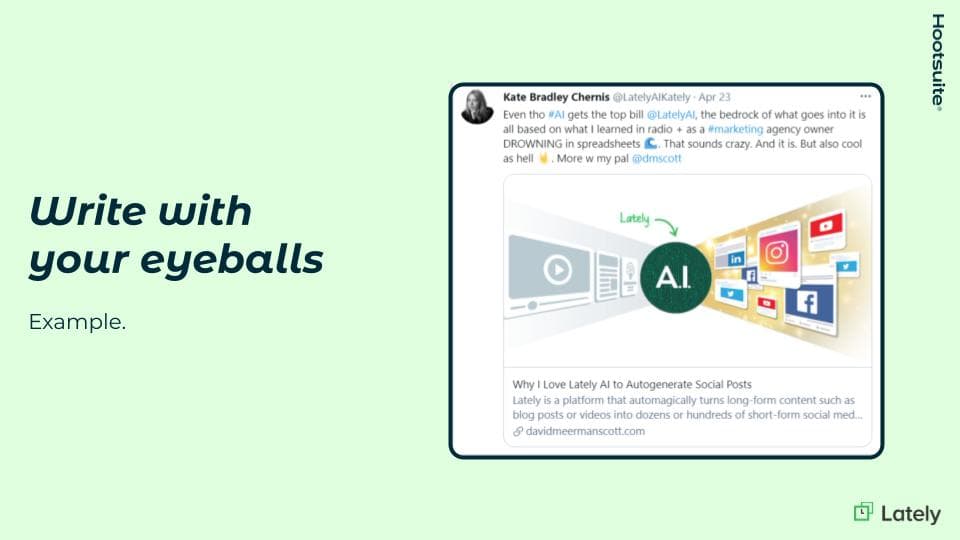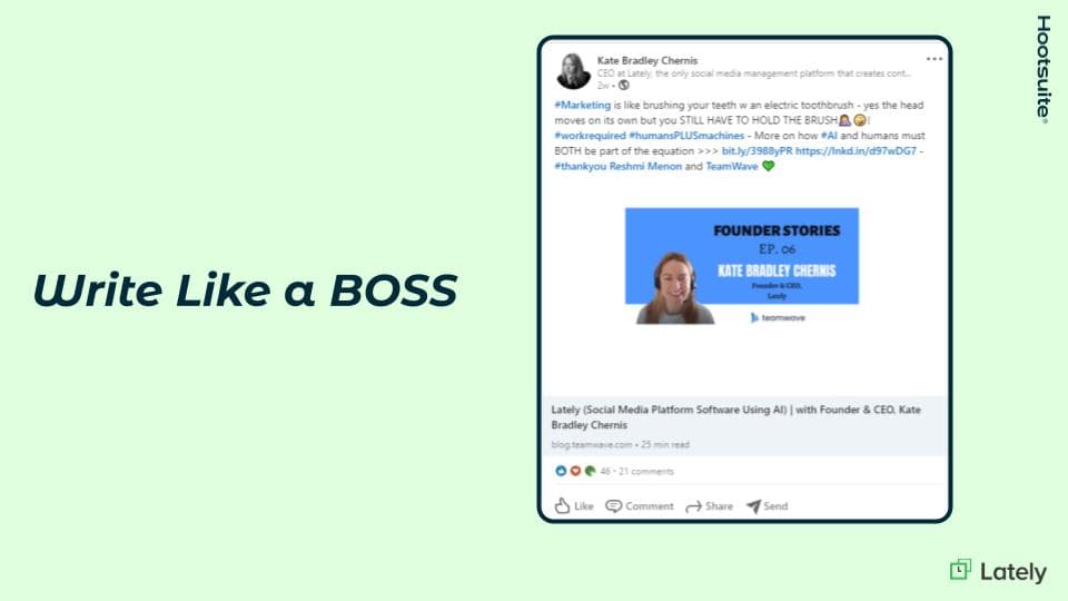 Copywriting isn’t a soft skill, it’s a core business tool. So put on your writing hat, grab some caffeine, and let’s get to work. Join our exclusive webinar with Lately.ai CEO Kate Bradley Chernis to learn how to turn flavorless statements into spicy calls-to-action.