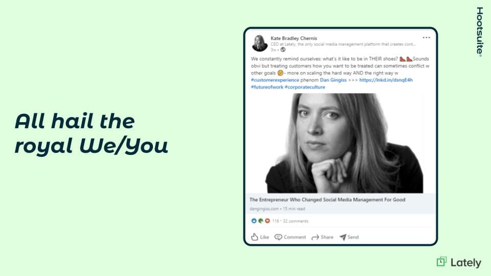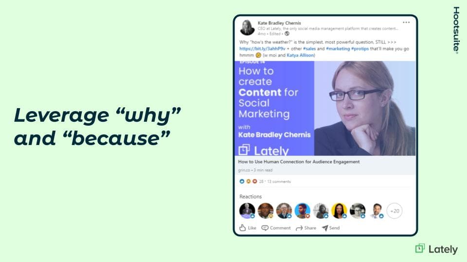 The post is calling out a specific group of people, ie. Sales peeps. Kate is writing this in her own style making it sound human and relatable, not a brand. Remember, people like interacting with people.